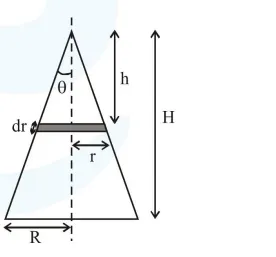 mass of element $\mathrm{dm}=\frac{\mathrm{M}}{\pi \mathrm{R} \sqrt{\mathrm{H}^{2}+\mathrm{R}^{2}}} \times \frac{2 \pi \mathrm{rdh}}{\cos \theta}$