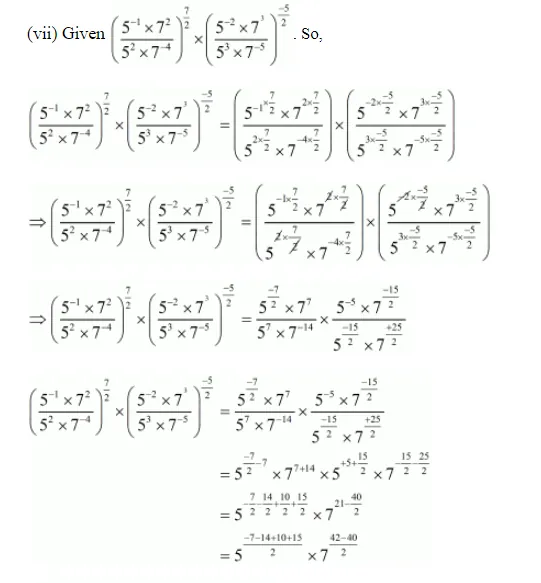 (vii) $\left(\frac{5^{-1} \times 7^{2}}{5^{2} \times 7^{-4}}\right)^{7 / 2} \times\left(\frac{5^{-2} \times 7^{3}}{5^{3} \times 7^{-5}}\right)^{-5 / 2}$