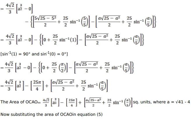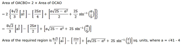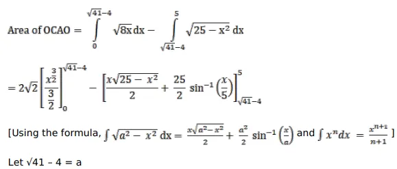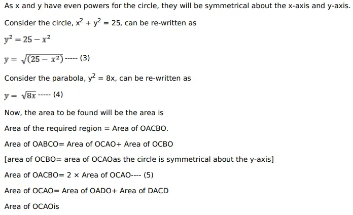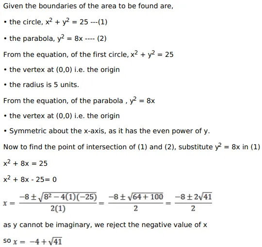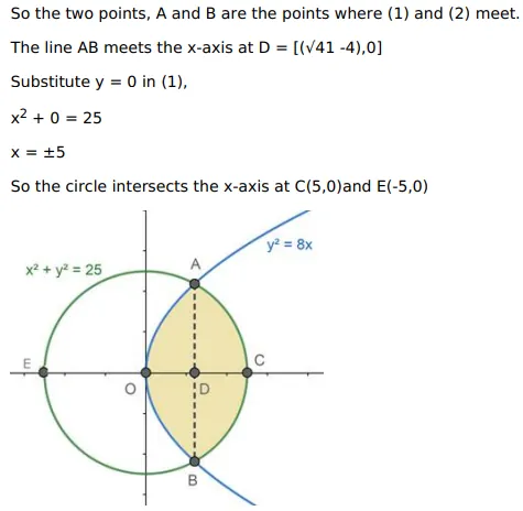 Sketch the region common to the circlex ${ }^{2}+y^{2}=25$ and the parabola $y^{2}=8 x .$ Also, find the area of the region, using integration.