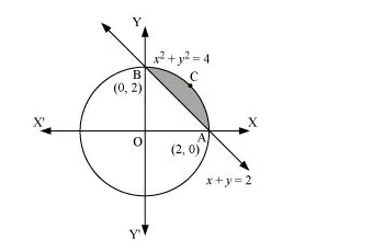 The smaller area enclosed by the circle, $x^{2}+y^{2}=4$, and the line, $x+y=2$, is represented by the shaded area ACBA as
