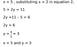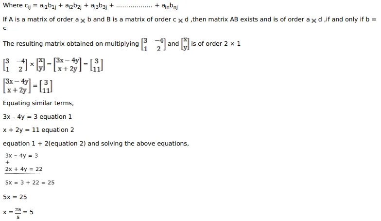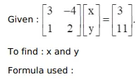 $\left[\begin{array}{cc}3 & -4 \\ 1 & 2\end{array}\right]\left[\begin{array}{l}x \\ y\end{array}\right]=\left[\begin{array}{l}3 \\ 11\end{array}\right]$
