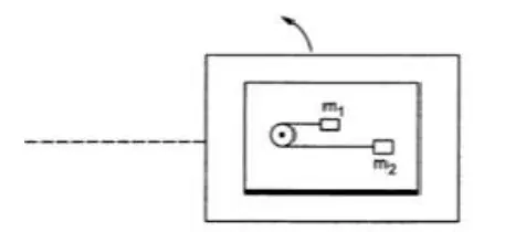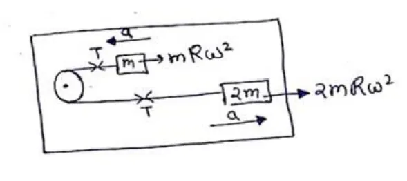 A table with smooth horizontal surface is placed in a cabin which moves in a circle of a large radius $\mathrm{R}$ (figure 7-E5). A smooth pulley of small radius is fastened to the table. Two masses $m$ and $2 m$ placed on the table are connected through a string going over the pulley. Initially the masses are held by a person with the strings along the outward radius and then the system is released from rest (with respect to the cabin). Find the magnitude of the initial acceleration of the masses as seen from the cabin and the tension in the string.