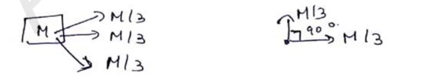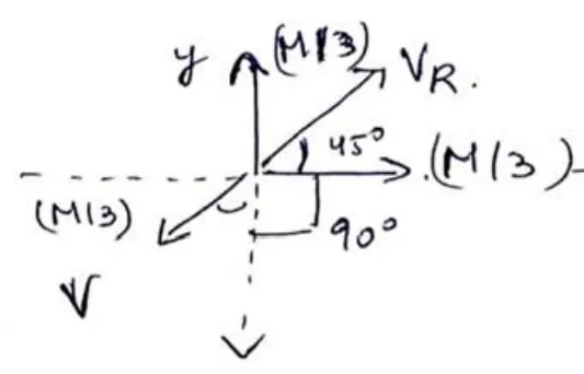 A block at rest explodes into three equal parts. Two parts starts moving along $X$ and $Y$ axes respectively with equal speeds of $10 \mathrm{~m} / \mathrm{s}$. Find the initial velocity of the third part.