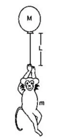 The balloon, the light rope and the monkey shown in figure are at rest in air. If the monkey reaches the top of the rope, by what distance does the balloon descend? Mass of the balloon=M, mass of the monkey $=m$ and length of the rope ascended by the monkey $=L$.