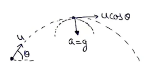 A particle is projected with a speed $u$ at an angle 0 with the horizontal. Consider a small part of its path near the highest position and take it approximately to be a circular arc. What is the radius of this circle? This radius is called the radius of curvature of the curve at the point.