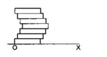 Seven homogeneous bricks, each of length $L$, are arranged in shown in figure. Each brick is displaced with respect to the one in contact by $L / 10$. Find the $x$-coordinate of the center of mass relative to the origin shown.