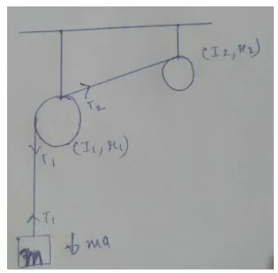 $m g-\left(\frac{I_{2}}{r_{2}^{2}}+\frac{I_{1}}{r_{1}^{2}}\right) a=m a$