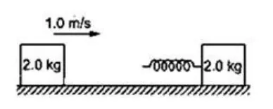 A block of mass $2.0 \mathrm{~kg}$ is moving on a frictionless horizontal surface with a velocity of $1.0 \mathrm{~m} / \mathrm{s}$ towards another block of mass kept at rest. The spring constant of the spring fixed at one end is $100 \mathrm{~N} / \mathrm{m}$. Find the maximum compression of the spring.