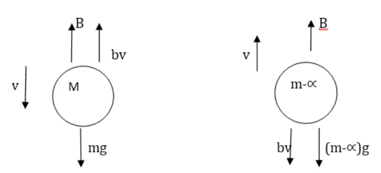 The force of buoyancy exerted by the atmosphere on a balloon is $B$ in the upward direction and remains constant. The force of air resistance on the balloon acts opposite to the direction of velocity and is proportional to it. The balloon carries a mass $M$ and is found to fall down near the earth's surface with a constant velocity v. How much mass should be removed from the balloon so that it may rise with a constant velocity v?
