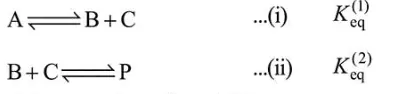 If the equilibrium constant for $\mathrm{A} \rightleftharpoons \mathrm{B}+\mathrm{C}$ is $\mathrm{K}_{\mathrm{eq}}^{(1)}$ and that of $\mathrm{B}+\mathrm{C} \rightleftharpoons \mathrm{P}$ is $\mathrm{K}_{\mathrm{eq}}^{(2)}$, the equilibrium constant for $\mathrm{A} \rightleftharpoons \mathrm{P}$ is :