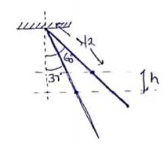 $\frac{1}{2}\left(\frac{m L^{2}}{3}\right) \omega^{2}=m g \frac{l}{2}\left(\cos 37^{\circ}-\cos 60^{\circ}\right)$