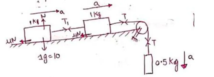 Consider the situation shown in figure. Calculate (a) the acceleration of the $1.0 \mathrm{~kg}$ blocks, (b) the tension in the string connecting the $1.0 \mathrm{~kg}$ blocks and (c) the tension in the string attached to $0.50 \mathrm{~kg}$.