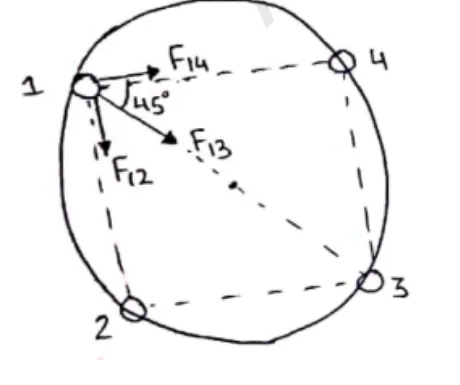 Due to particle 4: $\mathrm{F}_{14}=\frac{\mathrm{GMM}}{(\sqrt{2} \mathrm{R})^{2}}=\frac{\mathrm{GM}^{2}}{2 \mathrm{R}^{2}}$