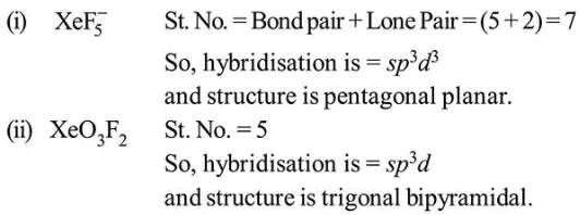 Question: The shape/ structure of $\left[\mathrm{XeF}_{5}\right]^{-}$and $\mathrm{XeO}_{3} \mathrm{~F}_{2}$, respectively, are: