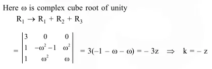 Question: Let $\omega$ be a complex number such that $2 \omega+1=z$ where $z=\sqrt{-3}$. If $\left|\begin{array}{ccc}1 & 1 & 1 \\ 1 & -\omega^{2}-1 & \omega^{2} \\ 1 & \omega^{2} & \omega^{7}\end{array}\right|=3 k$, then $\mathrm{k}$ is equal to :-