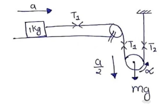 The descending pulley shown in figure has a radius $20 \mathrm{~cm}$ and moment of inertia $0.20 \mathrm{~kg}^{-} \mathrm{m}^{2}$. The fixed pulley is light and the horizontal plane frictionless. Find the acceleration of the block if its mass is $1.0 \mathrm{~kg}$.