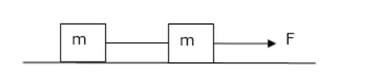Two blocks of equal mass $m$ are tied to each other through a light string. One of the blocks is pulled along the line joining them with a constant force F. Find the tension in the string joining the blocks.