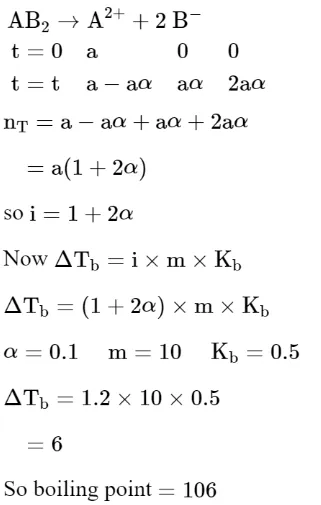 $\mathrm{AB}_{2}$ is $10 \%$ dissociated in water to $\mathrm{A}^{2+}$ and $\mathrm{B}^{-}$. The boiling point of a $10.0$ molal aqueous solution of $\mathrm{AB}_{2}$ is______________ . ${ }^{\circ} \mathrm{C}$. (Round off to the Nearest Integer). [Given : Molal elevation constant of water $\mathrm{K}_{\mathrm{b}}=0.5 \mathrm{~K} \mathrm{~kg} \mathrm{~mol}^{-1}$ boiling point of pure water $\left.=100^{\circ} \mathrm{C}\right]$