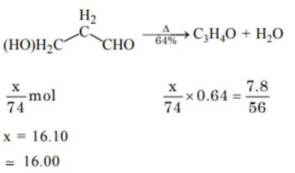 _______________grams of 3-Hydroxy propanal $(\mathrm{MW}=74)$ must be dehydrated to produce $7.8 \mathrm{~g}$ of acrolein $(\mathrm{MW}=56)\left(\mathrm{C}_{3} \mathrm{H}_{4} \mathrm{O}\right)$ if the percentage yield is 64. (Round off to the Nearest Integer).