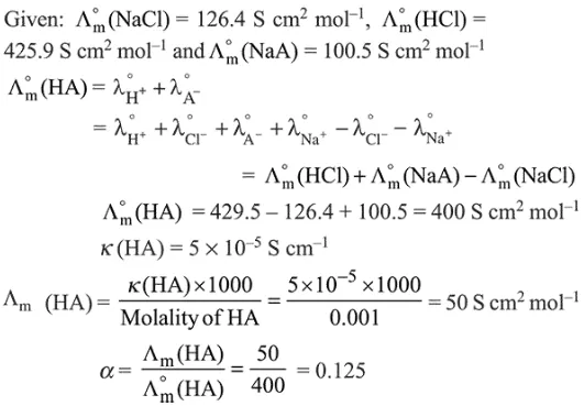 $\Lambda_{\mathrm{m}}^{\circ}$ for $\mathrm{NaCl}, \mathrm{HCl}$ and $\mathrm{NaA}$ are $126.4,425.9$ and $100.5 \mathrm{~S} \mathrm{~cm}^{2} \mathrm{~mol}^{-1}$, respectively. If the conductivity of $0.001$ M HA is $5 \times 10^{-5} \mathrm{~S} \mathrm{~cm}^{-1}$, degree of dissociation of HA is :