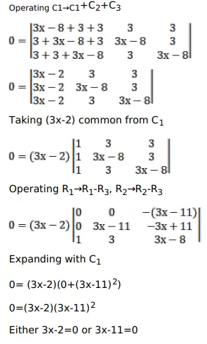$\left|\begin{array}{ccc}3 x-8 & 3 & 3 \\ 3 & 3 x-8 & 3 \\ 3 & 3 & 3 x-8\end{array}\right|=0$
