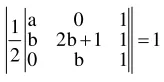 $\Rightarrow\left|\begin{array}{ccc}\mathrm{a} & 0 & 1 \\ \mathrm{~b} & 2 \mathrm{~b}+1 & 1 \\ 0 & \mathrm{~b} & 1\end{array}\right|=\pm 2$