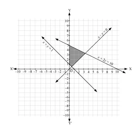 The graph of the lines, x + 2y = 10, x + y = 1, and x – y = 0, are drawn in the figure below.