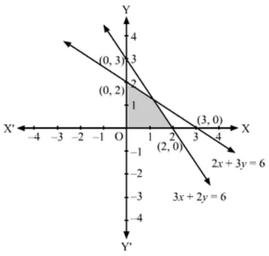 2x + 3y = 6, 3x + 2y = 6, x = 0, y = 0