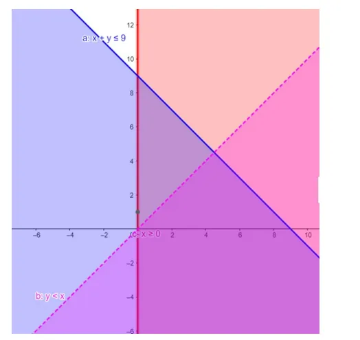 The graphical representation of $x+y \leq 9, y $x+y \leq 9 \ldots \ldots$ (1) $y $x \geq 0 \ldots \ldots$ (3) Inequality (1) represents the region below line $x+y=9$ (including the line $x+y=9$ ). Inequality (2) represents the region below line $x=y$ (excluding the line $x=y$ ). Inequality (3) represents the region in front of line $x=0$ (including the line $x=0$ ). Therefore,every point in the common shaded region including the points on the respective lines represents the solution for the given inequalities. This can be represented as follows,