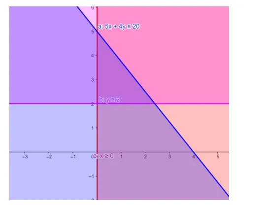 The graphical representation of $5 x+4 y \leq 20, x \geq 1, y \geq 2$ is given by common region in the figure below.