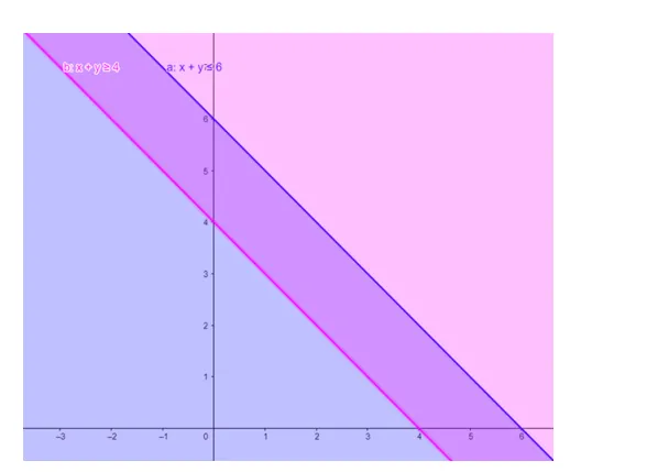 The graphical representation of $x+y \leq 6, x+y \geq 4$ is given by common region in the figure below.