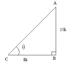 $\cos \theta=\frac{B C}{A C}=\frac{8 k}{17 k}=\frac{8}{17}$