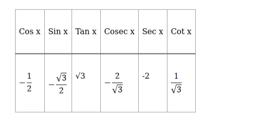 Given that: $\pi So, x lies in IIIrd Quadrant. So, sin and cos will be negative but tan will be positive. Now, we know that $\cos x=\frac{1}{\sec x}$ Putting the values, we get $\cos x=\frac{1}{-2}$ …(i) We know that, $\cos ^{2} x+\sin ^{2} x=1$ Putting the values, we get $\left(-\frac{1}{2}\right)^{2}+\sin ^{2} x=1$ [Given] $\Rightarrow \frac{1}{4}+\sin ^{2} x=1$ $\Rightarrow \sin ^{2} x=1-\frac{1}{4}$ $\Rightarrow \sin ^{2} x=\frac{4-1}{4}$ $\Rightarrow \sin ^{2} x=\frac{3}{4}$ $\Rightarrow \sin x=\sqrt{\frac{3}{4}}$ $\Rightarrow \sin x=\pm \frac{\sqrt{3}}{2}$ Since, $x$ in IIIrd quadrant and $\sin x$ is negative in IIIrd quadrant $\therefore \sin x=-\frac{\sqrt{3}}{2}$ Now, $\tan x=\frac{\sin x}{\cos x}$ Putting the values, we get $\tan x=\frac{-\frac{\sqrt{3}}{2}}{-\frac{1}{2}}$ $=-\frac{\sqrt{3}}{2} \times(-2)$ $=\sqrt{3}$ Now, $\operatorname{cosec} x=\frac{1}{\sin x}$ Putting the values, we get $\operatorname{cosec} x=\frac{1}{-\frac{\sqrt{3}}{2}}$ $=-\frac{2}{\sqrt{3}}$ Now $\cot x=\frac{1}{\tan x}$ Putting the values, we get $\cot x=\frac{1}{\sqrt{3}}$ Hence, the values of other trigonometric Functions are: