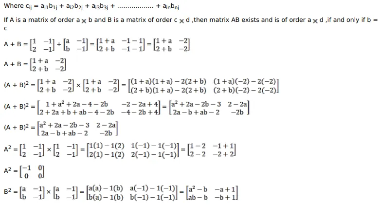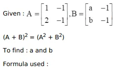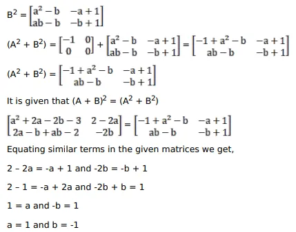 If $A=\left[\begin{array}{ll}1 & -1 \\ 2 & -1\end{array}\right], B=\left[\begin{array}{ll}a & -1 \\ b & -1\end{array}\right]$ and $(A+B)^{2}=\left(A^{2}+B^{2}\right)$ then find the values of $a$ and $b$.