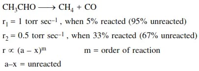 At $518^{\circ} \mathrm{C}$, the rate of decomposition of a sample of gaseous acetaldehyde, initially at a pressure of 363 Torr, was $1.00$ Torr s $^{-1}$ when $5 \%$ had reacted and $0.5$ Torr $^{-1}$ when $33 \%$ had reacted. The order of the reaction is: