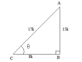 Now, $\tan \theta=\frac{A B}{B C}=\frac{15}{8}$ and $\sin \theta=\frac{A B}{A C}=\frac{15 k}{17 k}=\frac{15}{17}$