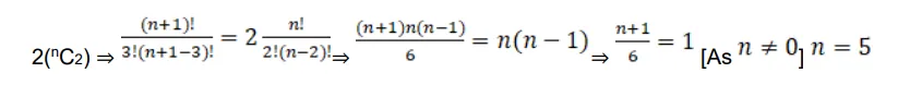 Given: ${ }^{n+1} C_{3}=2\left({ }^{n} C_{2}\right)$ Need to find: Value of $n \Rightarrow{ }^{n+1} C_{3}=$