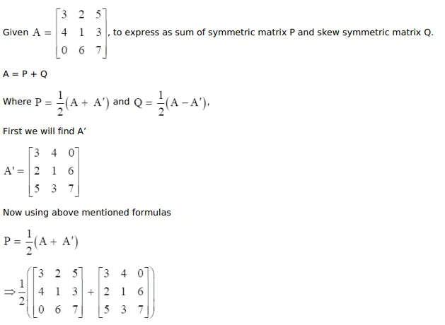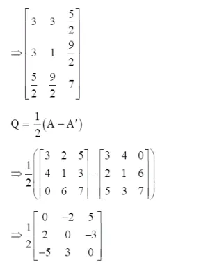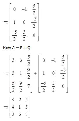 Express the matrix $A=\left[\begin{array}{lll}3 & 2 & 5 \\ 4 & 1 & 3 \\ 0 & 6 & 7\end{array}\right]$ as sum of two matrices such that one is symmetric and the other is skew-symmetric.