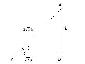 $\cos \theta=\frac{B C}{A C}=\frac{\sqrt{7} k}{2 \sqrt{2} k}=\frac{\sqrt{7}}{2 \sqrt{2}}$
