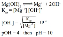 At $25^{\circ} \mathrm{C}$, the solubility producct of $\mathrm{Mg}(\mathrm{OH})_{2}$ is $1.0 \times 10^{-11}$. At which pH, will $\mathrm{Mg}^{2+}$ ions start precipitating in the form of $\mathrm{Mg}(\mathrm{OH})_{2}$ from a solution of $0.001 \mathrm{M} \mathrm{Mg}^{2+}$ ions ?