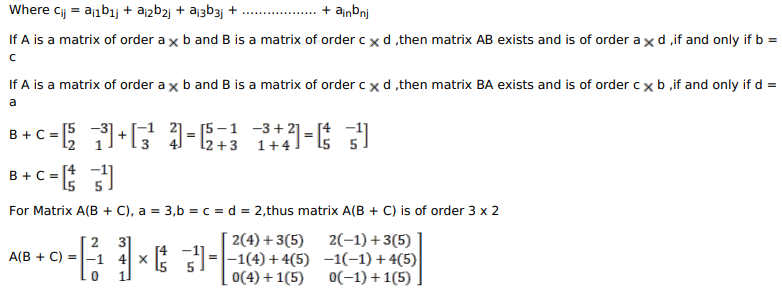 $\mathrm{A}=\left[\begin{array}{cc}2 & 3 \\ -1 & 4 \\ 0 & 1\end{array}\right], \mathrm{B}=\left[\begin{array}{cc}5 & -3 \\ 2 & 1\end{array}\right]$ and $\mathrm{C}=\left[\begin{array}{cc}-1 & 2 \\ 3 & 4\end{array}\right]$
