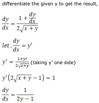 If $\mathrm{y}=\sqrt{\mathrm{x}+\mathrm{y}}$, prove that $\frac{\mathrm{dy}}{\mathrm{dx}}=\frac{1}{(2 \mathrm{y}-1)}$.