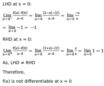 Let $f(x)=\left\{\begin{array}{ll}(2+x), & \text { if } x \geq 0 ; \\ (2-x), & \text { if } x<0\end{array}\right.$ Show that $f(x)$ is not derivable at $x=0$
