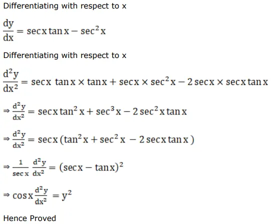 If $y=\sec x-\tan x .$ show that $(\cos x) \frac{d^{2} y}{d x^{2}}=y^{2}$