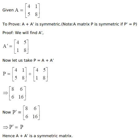 If $\mathrm{A}=\left[\begin{array}{cc}4 & 1 \\ 5 & 8\end{array}\right]$, show that $\left(\mathrm{A}+\mathrm{A}^{\prime}\right)$ is symmetric.