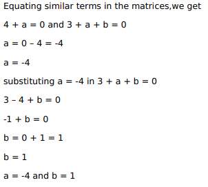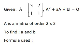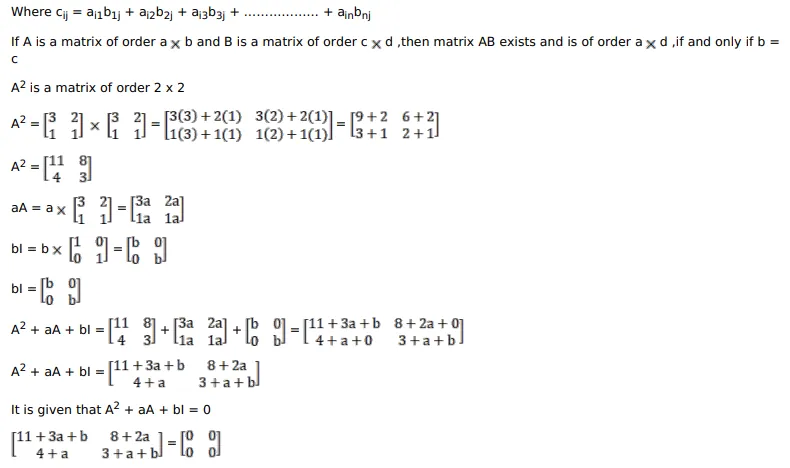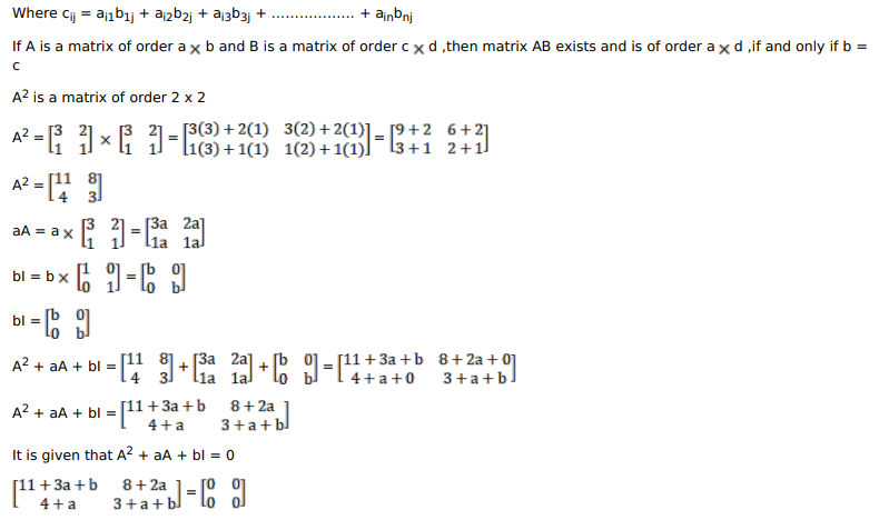 If $A=\left[\begin{array}{ll}3 & 2 \\ 1 & 1\end{array}\right]$, find the value of a and b such that $A^{2}+a A+b l=0$