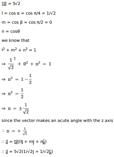 Find a vector $\vec{a}$ of magnitude $5 \sqrt{2}$, making an angle $\pi / 4$ with $x$ - axis, $\pi / 2$ with $y$ - axis and an acute angle $\theta$ with z - axis.