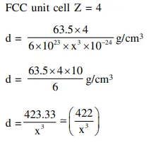 At $100^{\circ} \mathrm{C}$, copper $(\mathrm{Cu})$ has $\mathrm{FCC}$ unit cell structure with cell edge length of $x \AA$. What is the approximate density of $\mathrm{Cu}\left(\right.$ in $\mathrm{g} \mathrm{cm}^{-3}$ ) at this temperature ?