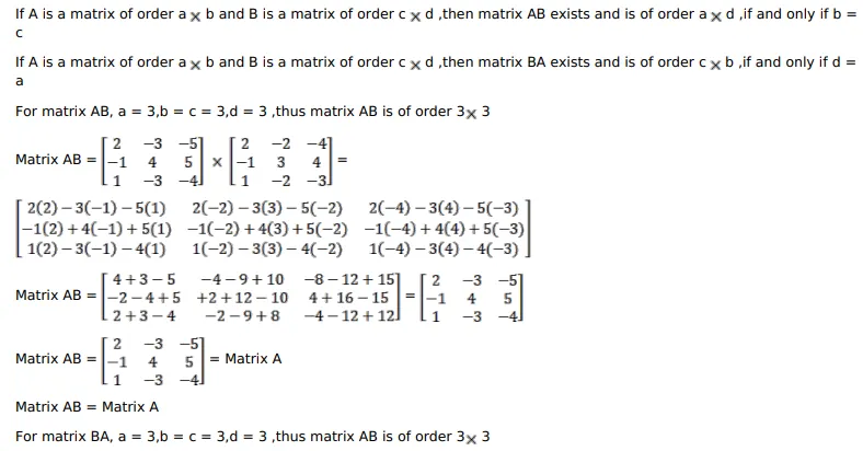 If $\mathrm{A}=\left[\begin{array}{ccc}2 & -3 & -5 \\ -1 & 4 & 5 \\ 1 & -3 & -4\end{array}\right]$ and $\mathrm{B}=\left[\begin{array}{ccc}2 & -2 & -4 \\ -1 & 3 & 4 \\ 1 & -2 & -3\end{array}\right]$, shown that $\mathrm{AB}=\mathrm{A}$ and $\mathrm{BA}=\mathrm{B}$.