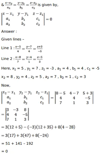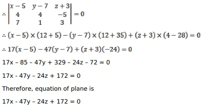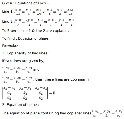 Show that the lines $\frac{5-x}{-4}=\frac{y-7}{4}=\frac{z-3}{-5}$ and $\frac{x-8}{7}=\frac{2 y-8}{2}=\frac{z-5}{3}$ are coplanar. Find the equation of the plane containing these lines.